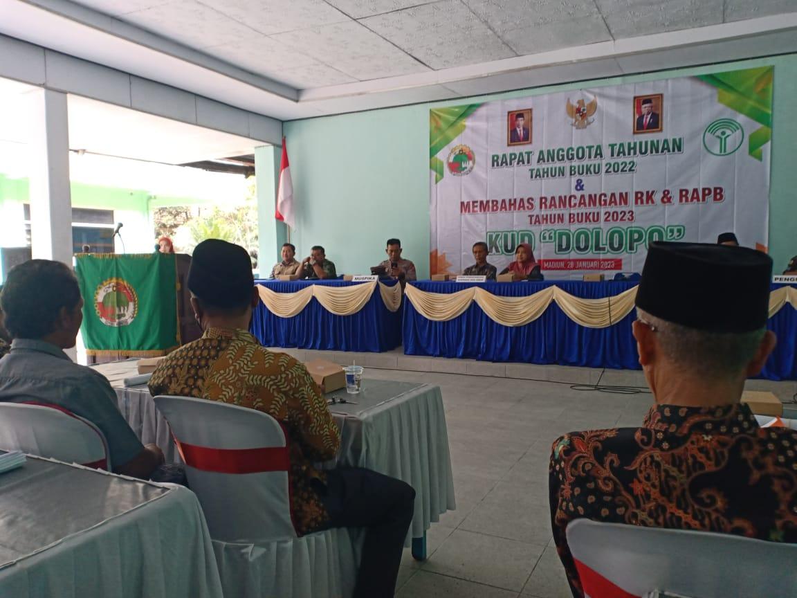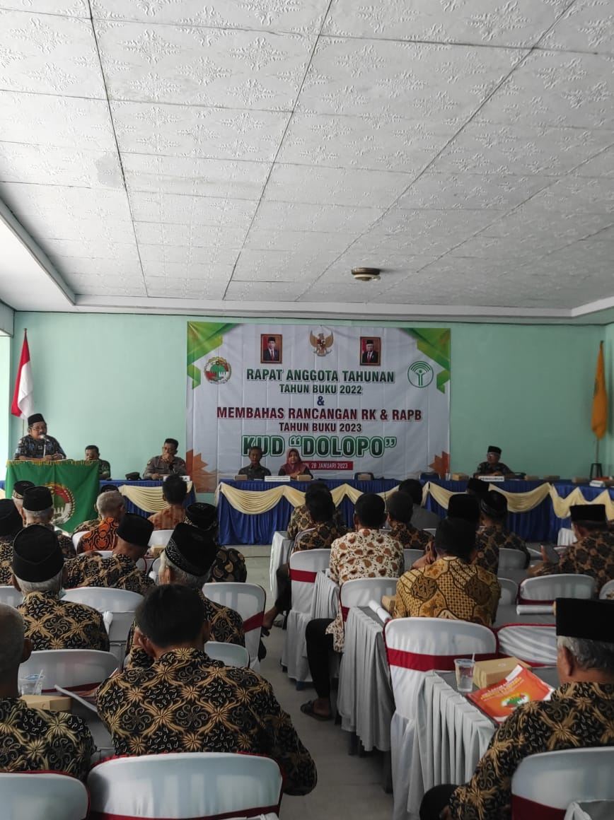 Dokumentasi Rapat Anggota Tahunan KUD Dolopo RAT tahun buku dilaksanakan hari Sabtu tanggal 28 Januari 2023 kantor KUD Dolopo Rapat dihadiri dari Dinas Perdagangan koperasi dan usaha mikro kab. Madiun, muspika, Dekopinda dan Dinas pertanian. Ucapan selamat dan sukses disampaikan dari pejabat yang hadir, dengan harapan kedepan KUD Dolopo semakin berkembang sesuai harapan anggota, Dekopinda mengharapkan insan koperasi dibawah naungan KUD Dolopo selalu meningkatkan SDM nya guna menguti perkembangan jaman. Disampaikan dalam laporan usaha yang dijalankan adalah simpan pinjam, penyaluran pupuk, dan pembayaran rekening listrik. Dalam tahun 2022 KUD Dolopo masuk peringkat 3 untuk penilaian KUD berprestasi. Sukses KUD Dolopo, sejahtera anggotanya.